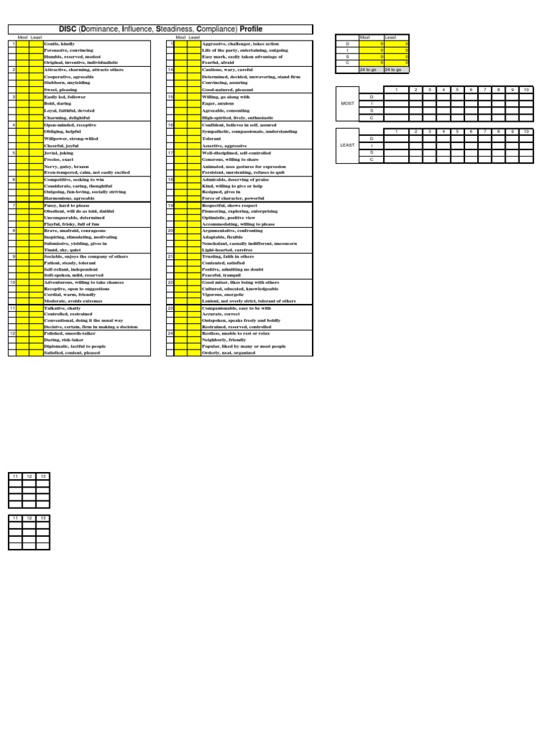 Web free disc personality test. 1 being “strongly disagree” and 5 being “strongly agree”. Web quick steps to complete and design signnow disc assessment pdf online: Web try this short personality quiz to get an estimate of your strongest personality traits. Web up to 15% cash back disc assessment: Web understanding yourself (disc) circle only one word in each row that you feel describes you best right now. Discover the answers you need here! Web all of the tests on this list are free and printable. Ad improve communication, productivity, and conflict management in the workplace with disc. Web the disc behavior survey will help you discover and appreciate the unique personality god has given you, an important component in how you are “wired” for service and. After taking the disc profile, you will see your. Web a free disc assessment is a powerful tool that helps you understand your personality traits and work style without any cost. Web this free disc personality test lets you quickly determine your disc type and personality profile. Understand unique strengths and tendencies of each team member to improve team dynamics. Web take a free disc personality test. Web conscientiousness these disc factors are represented visually as a circular grid that is divided into four quadrants. This free personality test gives you an an estimate of your disc profile based on your answers to 12 short questions. Our free disc personality test will. Use get form or simply click on the template preview to open it in the editor. By taking this assessment, you can gain valuable.