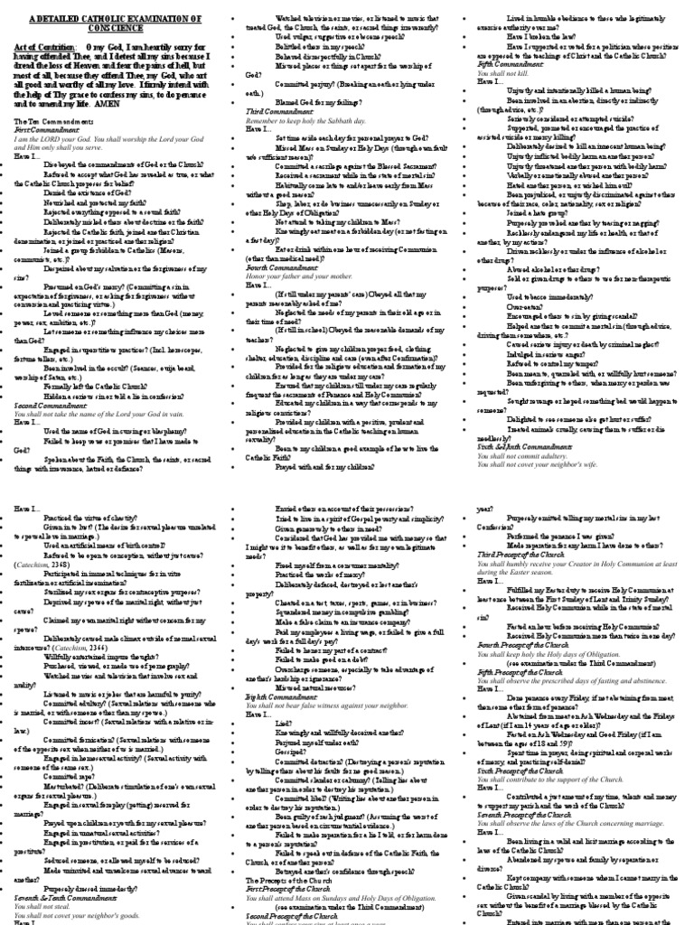 It's important for a good catholic examination of conscience to be thorough. Web there are various species for examinations of conscience and regardless von which one you utilize till prepare yourself for and sacrament it should be rooted in scripture; We reflect on the the ten commandments and the teachings of the church. Below are a few examples of examinations.